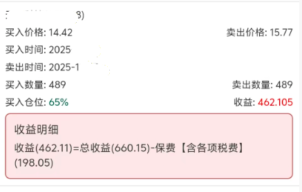 例如,当天投保的是某科技股,买入价格为14.42元,卖出价格为15.77元,用户交易数量489股,收益就是462.11元,即总收益660.15元减去保费198.05元。
