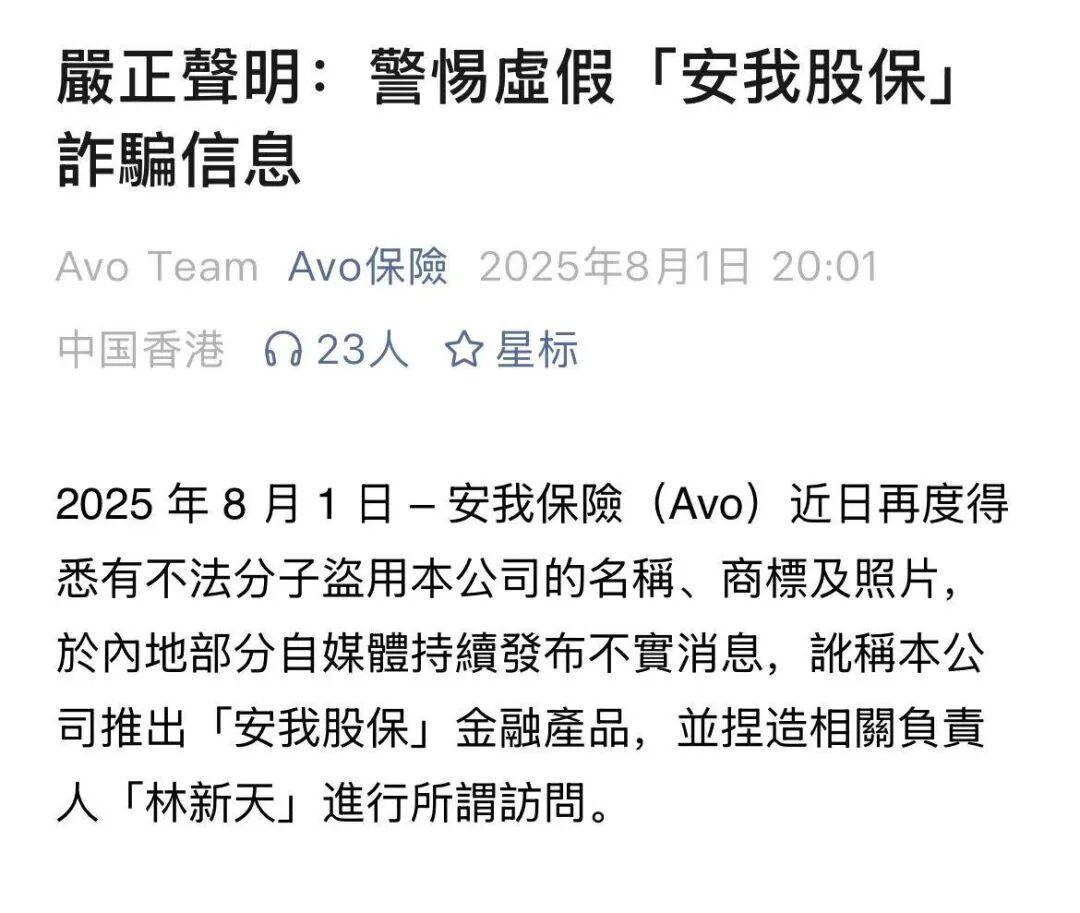 《每日经济新闻》记者注意到,香港安我保险的官方服务号上置顶了两篇跟“安我股保”相关的声明。声明提到:安我保险近日再度得悉有不法分子盗用本公司的名称、商标及照片,于内地部分自媒体持续发布不实消息,讹称本公司推出“安我股保”金融产品,并捏造相关负责人“林新天”进行所谓访问。