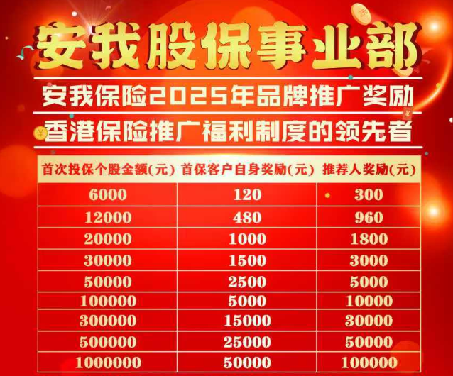就推广福利制度而言,前述推介人员提供的资料显示,“安我股保”对首保客户和推荐人均有奖励。例如,用户首次投保个股金额6000元,平台会奖励首保客户自身120元,奖励推荐人300元。以此类推,首次投保用户的个股金额最高可投100万元,平台对应奖励首保客户5万元,奖励推荐人10万元。
