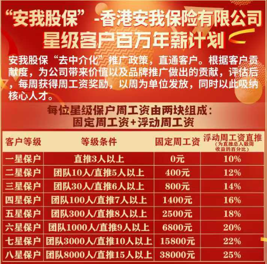 对于星级客户百万年薪计划,“安我股保”服务号发布的信息显示,“安我股保”会根据客户贡献度,为公司带来的价值以及品牌推广做出的贡献,给予客户一定的周工资奖励。