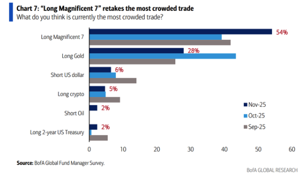 在本月FMS报告中,54%的基金经理将“做多美股七巨头”列为最拥挤的交易,这一比例较10月的不到40%显著上升。此前,“做多黄金”曾被评为最拥挤交易,但在本次调查中仅获得28%的投票,较10月的43%大幅下降。
