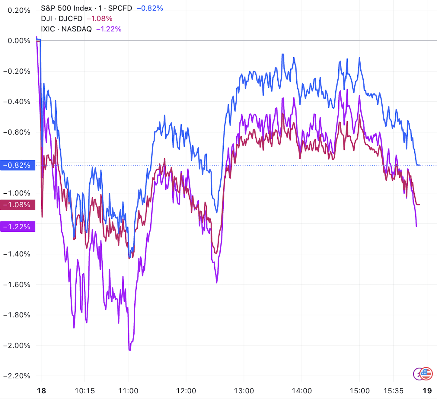 财联社11月19日讯(编辑 夏军雄)美东时间周二,受科技股估值过高担忧情绪持续发酵影响,美股三大指数集体收跌,纳斯达克指数和道琼斯指数跌幅均超过1%。市场对人工智能(AI)领域的高估值及债务累积风险表现出明显担忧,部分机构警告标普500指数可能面临8%-9%回调。