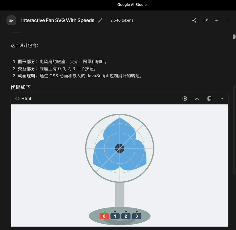 1. 交互式SVG生成:输入指令后,Gemini 3在5秒内生成可调节风速的电风扇矢量图,并支持实时参数修改。