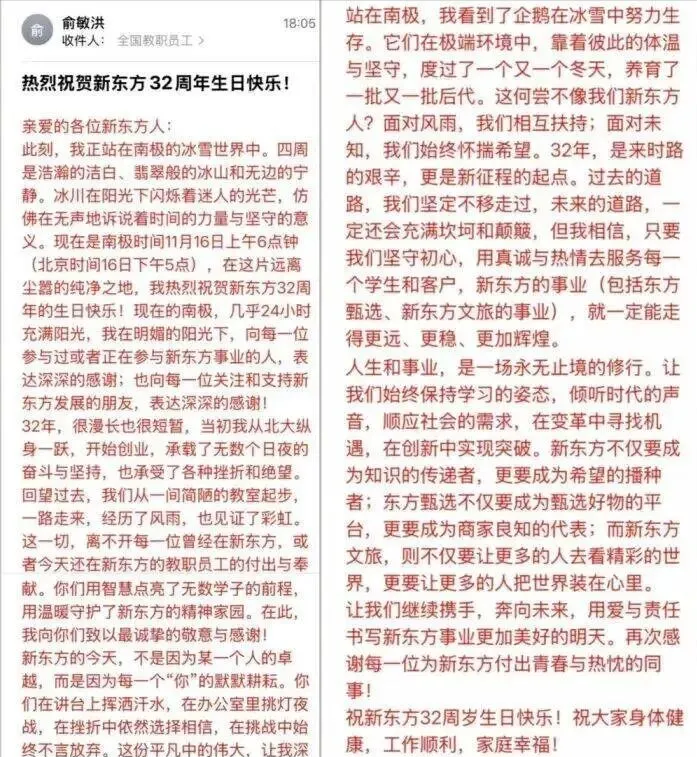 11月16日,新东方迎来32周年纪念日。创始人俞敏洪在个人公众号发布全员信,以“冰雪中的坚守”为主题,描绘南极的“浩瀚洁白”与“翡翠冰山”,感谢员工付出并擘画公司未来蓝图:新东方要成为“希望的播种者”,东方甄选应成为“商家良知的代表”,新东方文旅则要“让更多人把世界装在心里”。