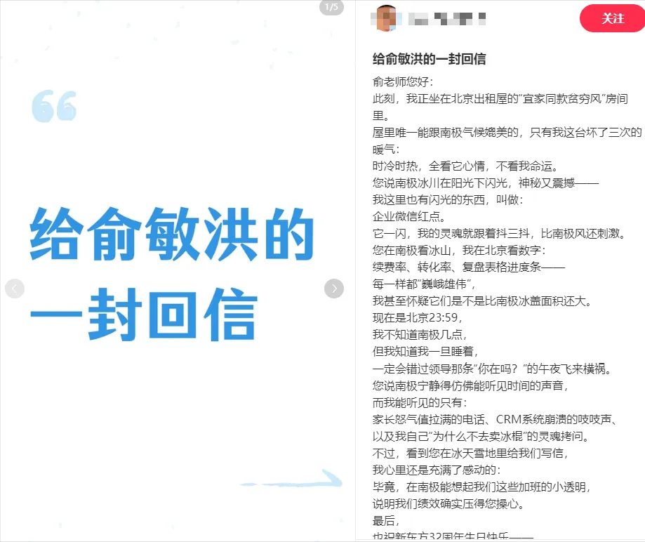 然而,这封充满激情的全员信却意外引发员工大量吐槽。社交平台上,“今夜,所有xdfer都是南极人”“您在南极看冰山,我在出租屋看数字”等调侃刷屏。有员工直言无法与正在旅游的老板共情,甚至喊话:“老板写得真有文采,但周年庆感谢员工,奖金发了吗?”