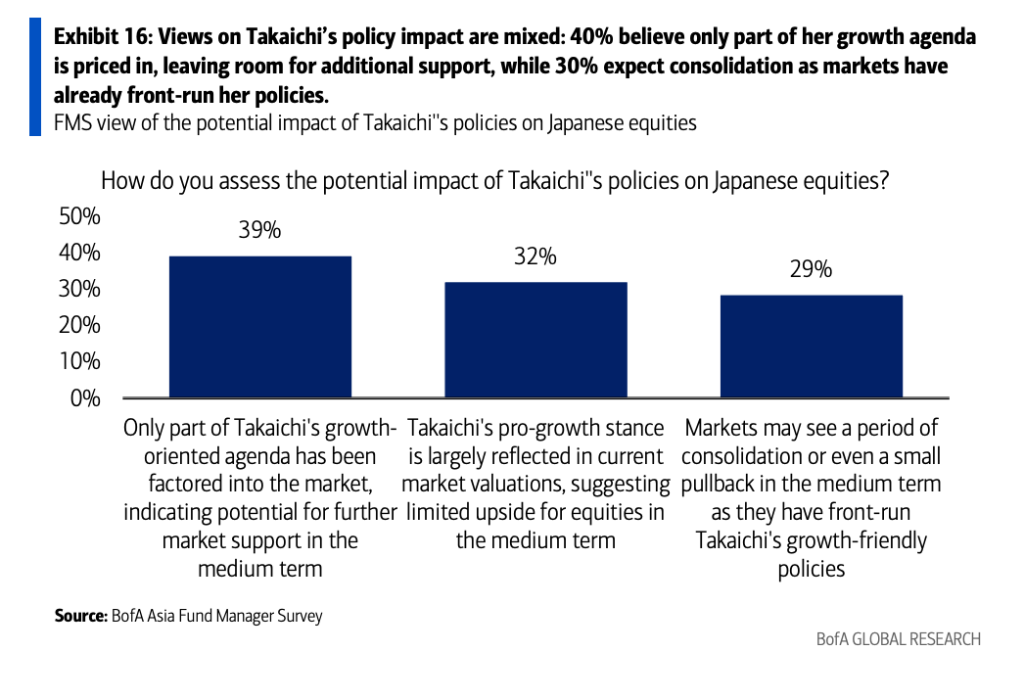 然而,对于日本首相高市早苗的经济政策效果,投资者存在明显分歧:40%认为市场尚未充分反映其经济增长计划的价值,后续仍有上涨空间;30%则预计市场将进入横盘整理阶段,短期突破难度较大。这种政策效果的不确定性,为日本市场增添了变数。