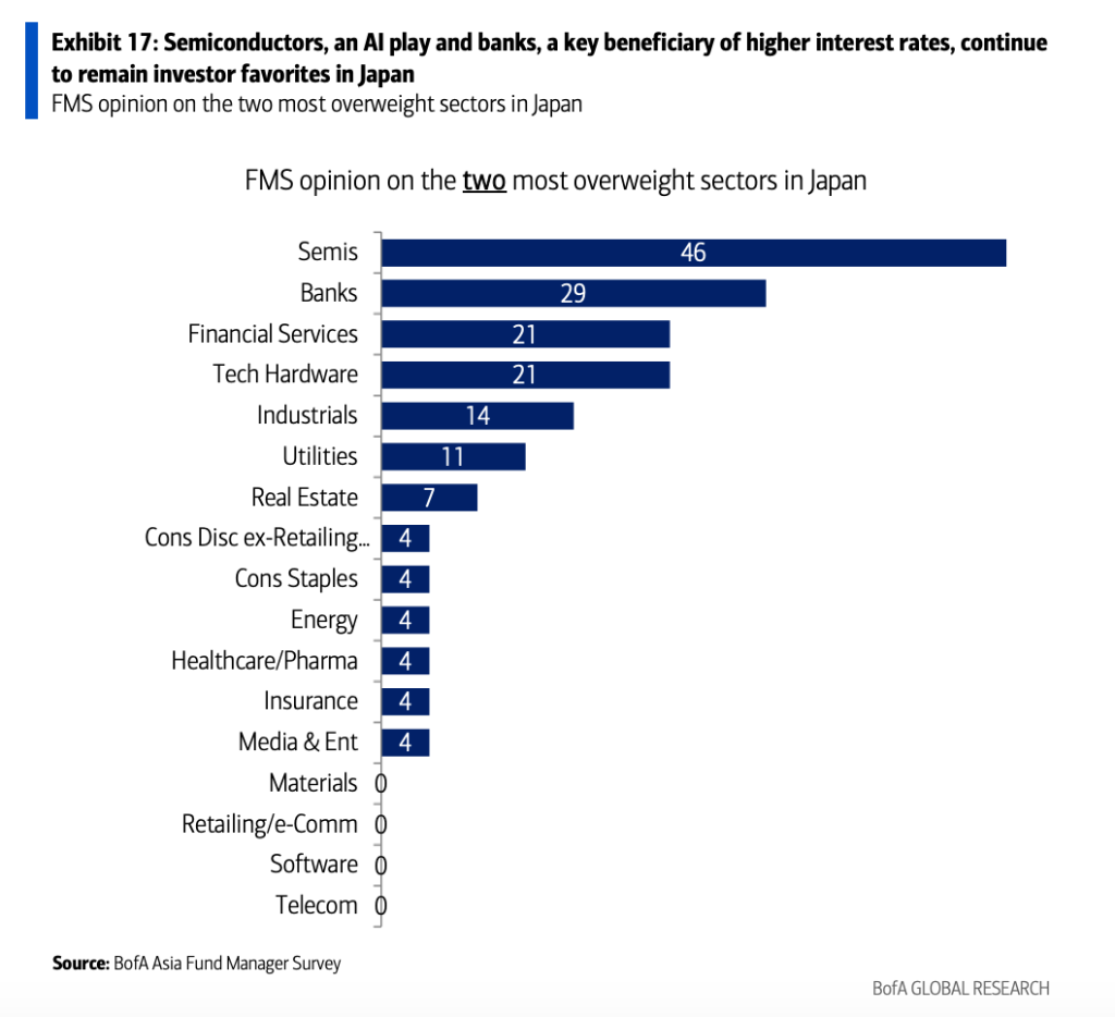 在行业配置方面,半导体(46%)与银行股(29%)持续占据投资者偏好前列,自2023年10月纳入调查以来始终稳居榜首。此外,约三分之二的受访者预计日本央行将在2026年第一季度启动加息,这一预期将直接影响日元资产定价和跨境资本流动。
