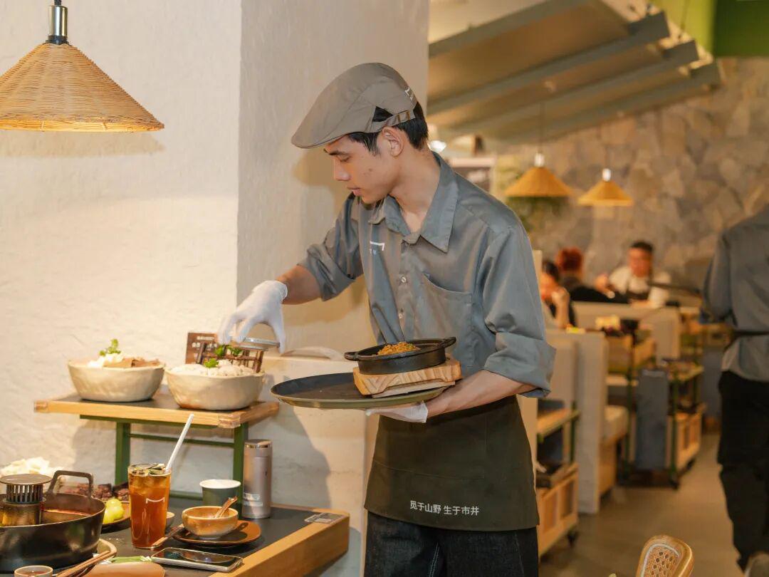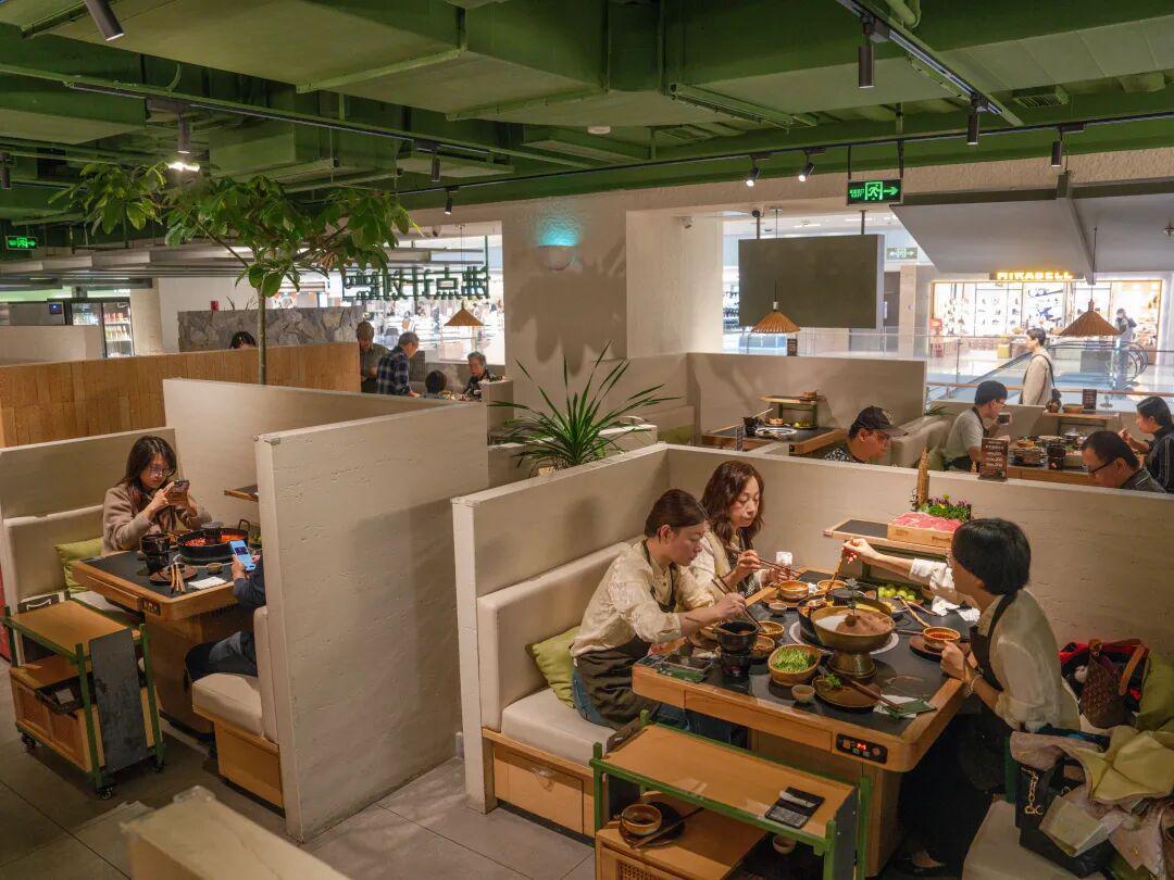 门店以原木与绿植为主色调,搭配藤编元素与暖黄灯光,营造出“随手拍即森系大片”的自然氛围。通过新鲜直达的食材、慢熬汤底、山系服务与文化共鸣,将就餐升级为完整的自然生活体验,成功实现品牌溢价。