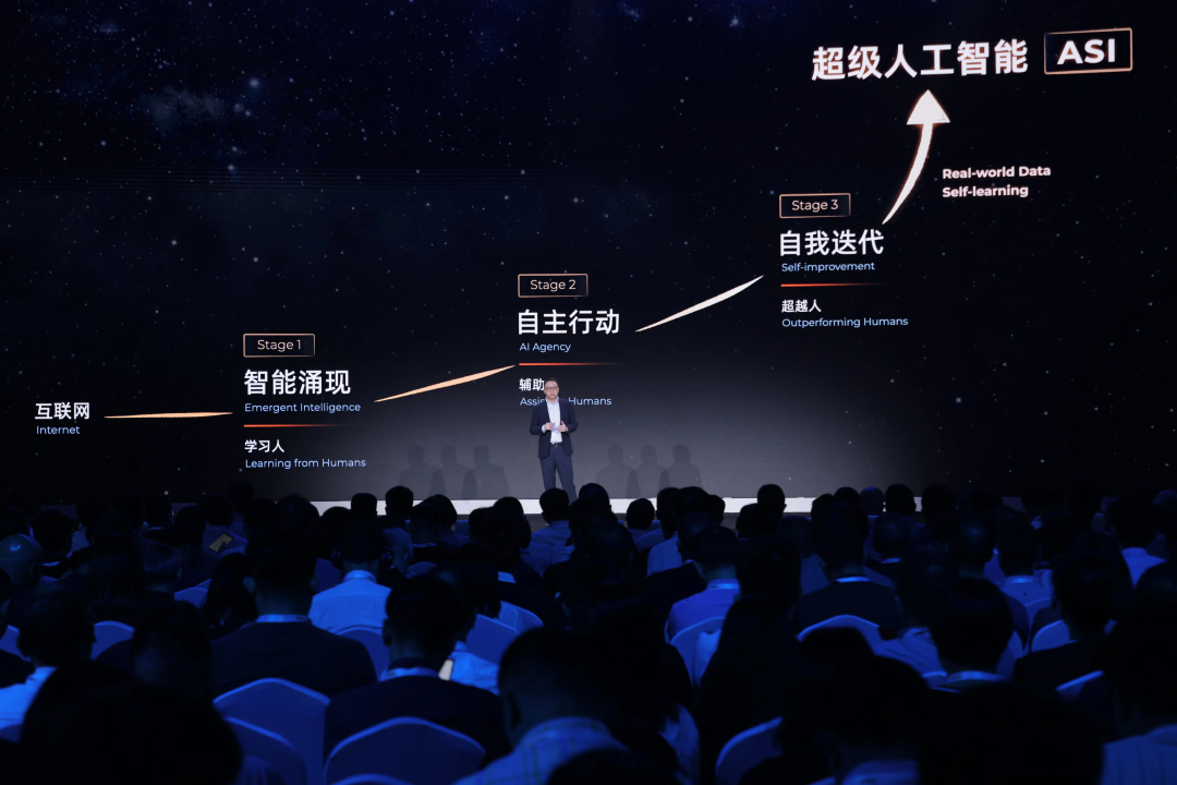 面向未来,吴泳铭将通往ASI的路径分为三个阶段:第一阶段是“智能涌现”,AI通过学习人类知识具备泛化智能,目前通义千问已进入这一阶段;第二阶段是“自主行动”,AI掌握工具使用和编程能力以“辅助人”;第三阶段是“自我迭代”,AI通过连接物理世界的全量原始数据实现自学习,最终达成“超越人”。
