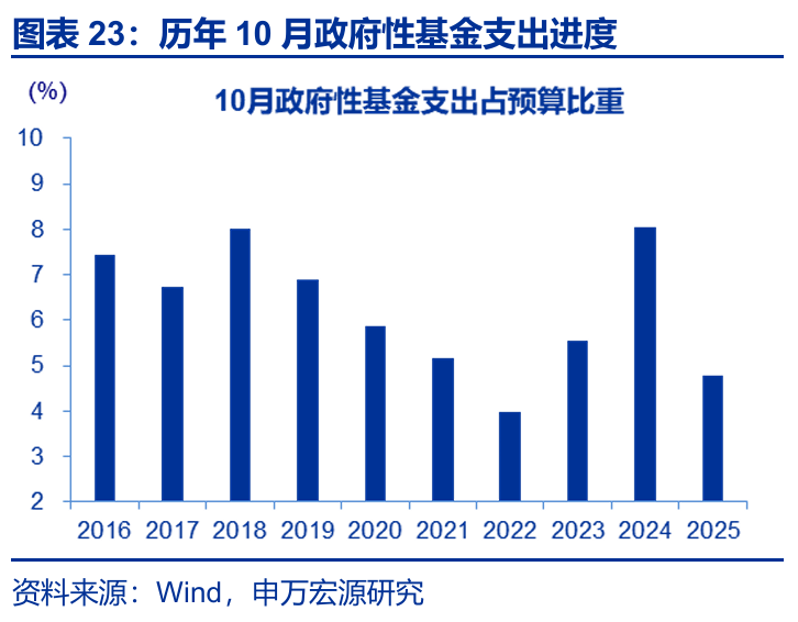 政府债大规模支持接近尾声叠加土地出让收入明显回落,使得政府性基金支出大幅下滑。2025年10月政府性基金支出同比-38.2%、较9月增速回落超38个百分点。政府性基金支出回落,部分缘于地方国有土地出让收入增速下滑,10月同比-27.3%;同时,基于政府债务融资支持的财政前置加力支出或也接近尾声。从预算完成度看,2025年10月政府性基金支出预算完成度4.8%,低于过去五年同期平均的5.7%。