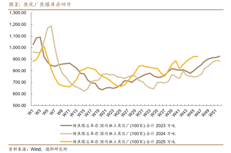 供需预期转弱,焦煤延续调整。近期焦煤期货延续调整,或因供需预期有所转弱,供给端,国家发改委供暖季能源保供会议释放稳定供应信号,明确加强煤炭生产组织和运输保障,或削弱市场对冬季供应短缺的担忧,导致前期基于“供应收缩”的上涨逻辑部分逆转;需求端,10月以来炼焦煤市场从“库存偏低”转向“中下游小幅累积”,焦化厂焦煤库存回升至近半年高位且高于往年同期,或对现货端支撑有所削弱。我们认为焦煤中长期供需紧平衡格局未根本改变,未来需重点关注行业安全检查进展和反内卷落地情况。