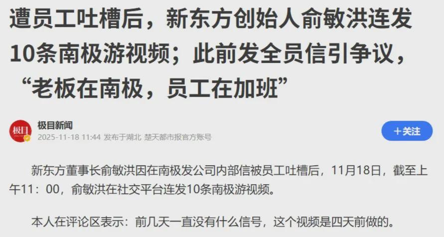 面对员工的吐槽,俞敏洪并未停止他的“南极秀”,反而连发了十条南极旅游视频。