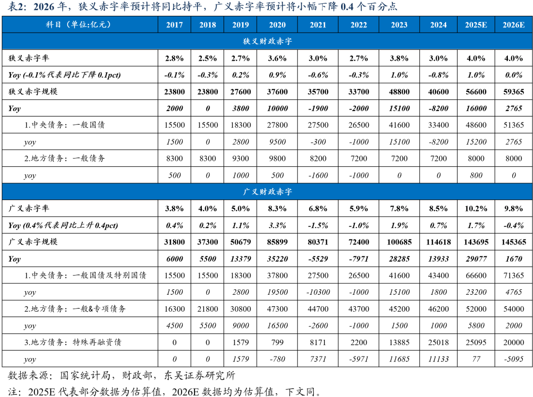 1. 2026年赤字展望:狭义赤字率同比持平,广义赤字率小幅下降