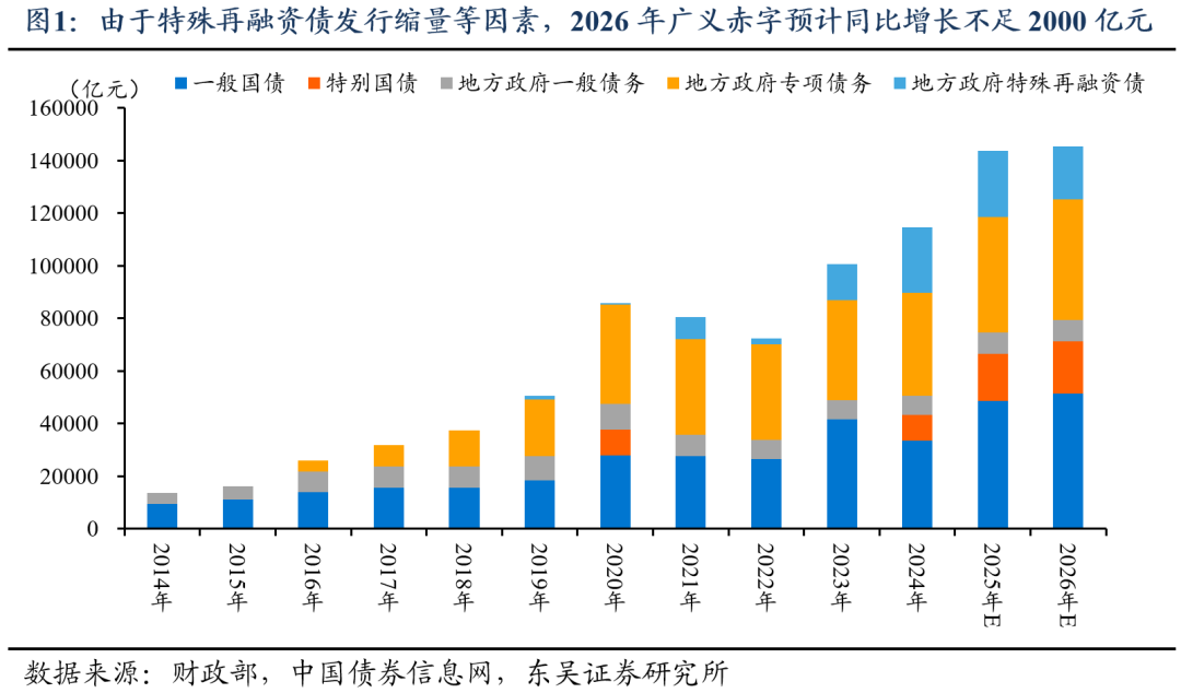 如果在财政支出的基础上,额外考虑地方政府特殊再融资债发行、融资平台有息负债增量带来的支出,那么我们预计2026年全国“广义财政支出”有望实现46.56万亿元,同比增长1.9%,该增速低于2026年全国财政支出增速预期约1.3个百分点,主要由于地方政府特殊再融资债或将缩量发行。具体而言,2025Q4地方政府特殊再融资债额外安排2000亿元额度用于支持部分省份投资建设,3000亿元额度用于补充地方政府综合财力(支持地方政府化解存量政府投资项目债务、消化政府拖欠企业账款等),2026年上述5000亿元额度预计将不再安排。
