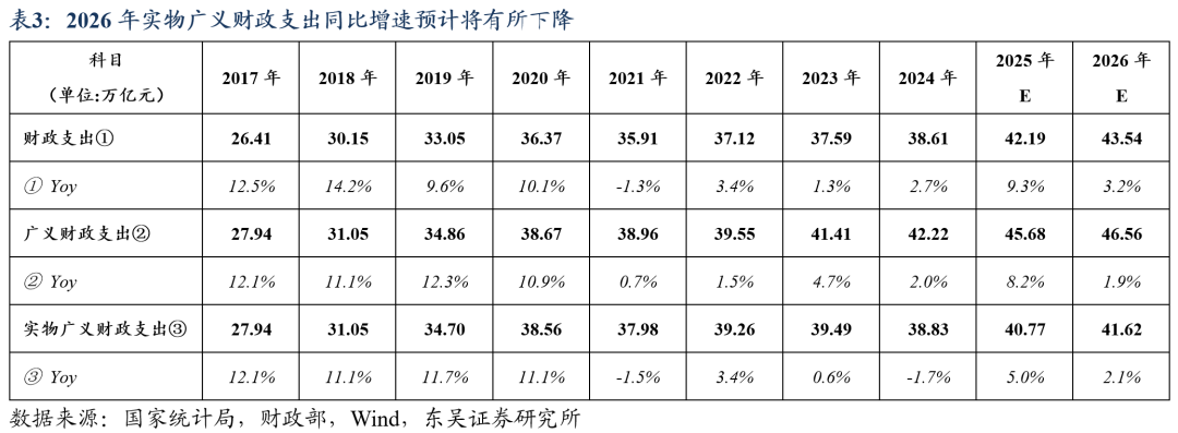 分“财政支出→广义财政支出→实物广义财政支出”三个层级看,预计2026年上述支出将分别同比增长3.2%、1.9%、2.1%。