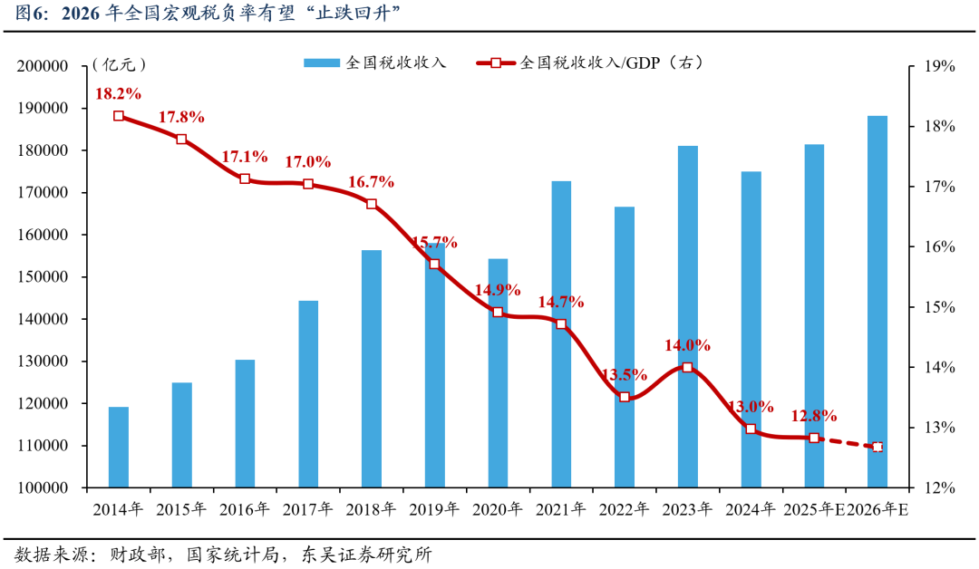 2025年10月,《中共中央关于制定国民经济和社会发展第十五个五年规划的建议》提出,要规范税收优惠政策,保持合理的宏观税负水平。参考以“全国税收收入/GDP”测算的宏观税负率指标,自2014年至2025年,国内宏观税负水平持续下降,上述指标由超过18%下降至不足13%。2025年,全国宏观税负率预计为12.8%,同比下降0.2个百分点。