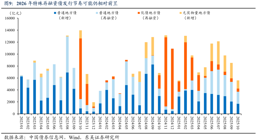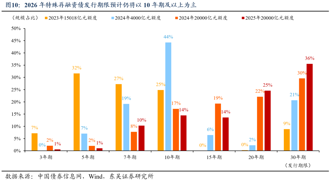 细分发行节奏与发行期限看,2026年特殊再融资债的发行用途预计均为置换存量隐性债务,参考过往相同用途的地方债发行统计,我们预计2026年特殊再融资债发行节奏可能仍相对前置,即当年上半年基本完成全年额度的发行使用;发行期限预计仍将以10年期(含)以上为主,10年期(含)以上的特殊再融资债发行规模占比预计仍将维持在88%左右。