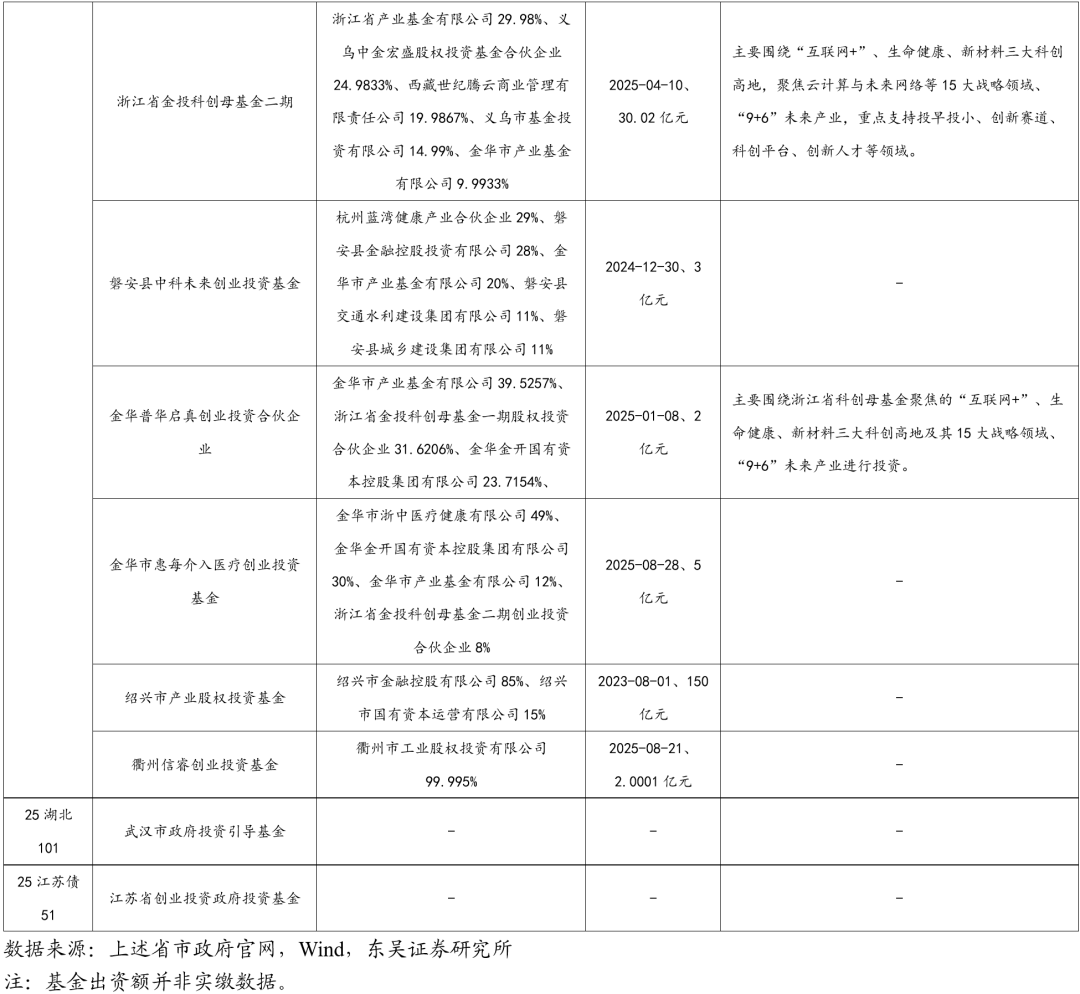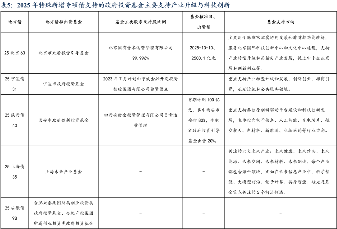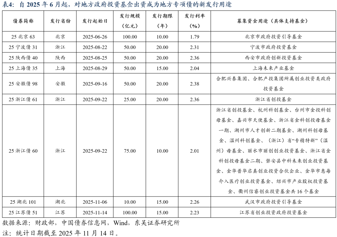 其中,尤其值得关注的是,自2025年6月起,对地方政府投资基金出资的特殊新增专项债发行规模逐步增多。自2025年6月1日至11月14日,北京、浙江、陕西、上海、安徽、湖北、江苏7省累计发行用于对地方政府投资基金出资的特殊新增专项债510亿元,获得上述地方债资金支持的地方政府投资基金主要支持产业升级与科技创新,服务于当地招商引资与支柱产业建设工作。在相关地方政府投资基金的投资案例中,不乏知名科创企业及上市公司的身影,例如: