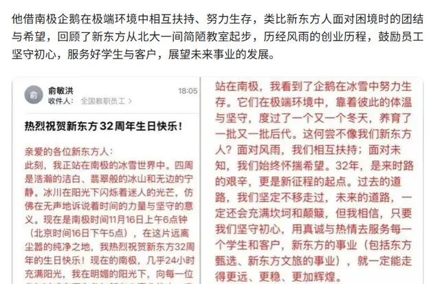 2025年11月16日,新东方成立32周年之际,俞敏洪从南极发回全员信。信中描绘的“翡翠般的冰山与无边的宁静”与员工们“企业微信红点闪烁”的加班场景形成鲜明对比。数据显示,这封信中17次出现“我”、5次提及“南极”,却对员工压力只字未提。次日,一篇《给俞敏洪的一封回信》以“北京出租屋里的普通员工”视角回应:“您那里有冰川闪光,我这里只有未读消息的红点”,将舆论推向高潮。