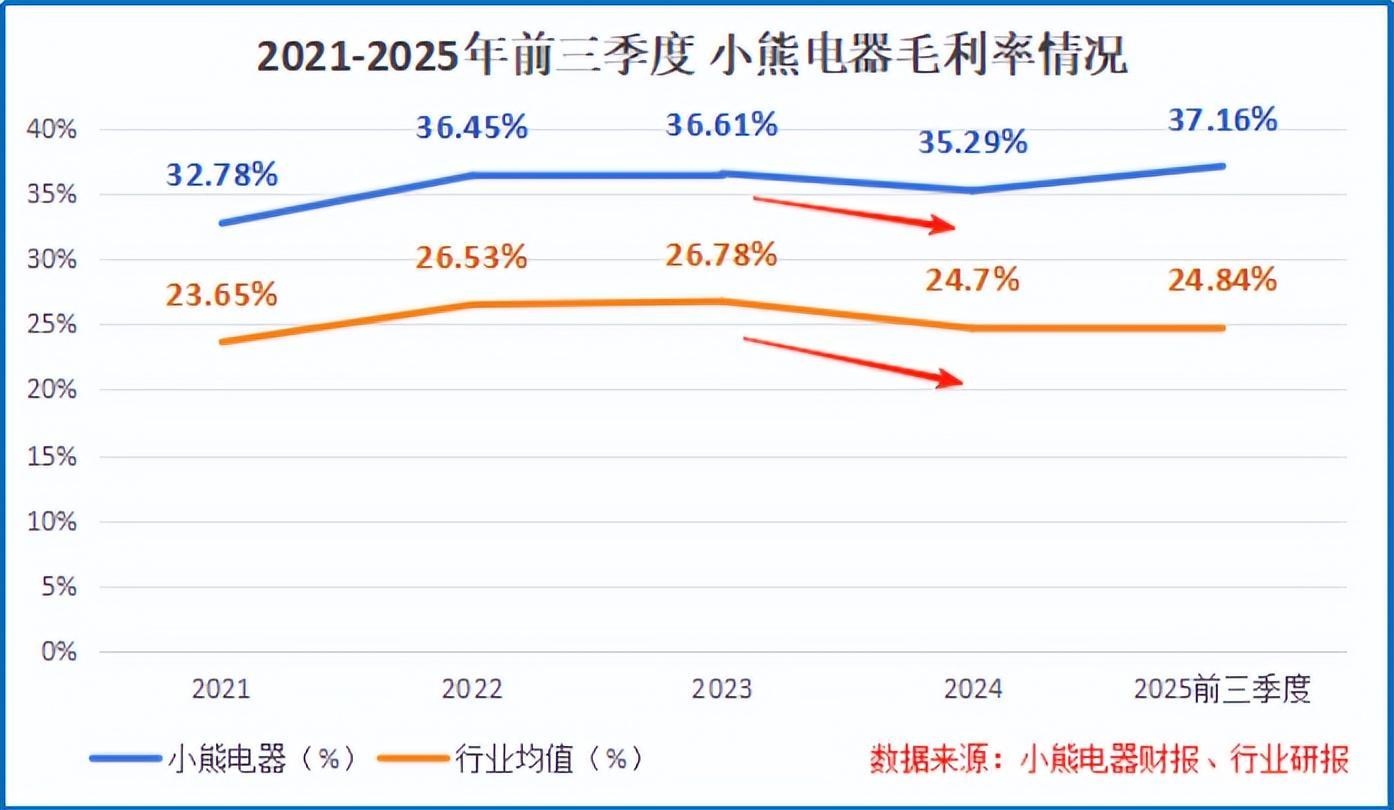 随着小家电行业技术壁垒的逐渐降低,越来越多的入场者开始涌入市场。美的、苏泊尔等巨头凭借其规模与渠道优势,频频发动价格竞争与促销攻势,激烈地争夺着每一寸市场。与此同时,消费者的换新动力也明显疲软,换新周期从2021年的约2.2年显著延长至3.5年。市场从“抢新增”变成了“挣存量”,行业整体毛利率被不断拉低。为了不掉队,小熊电器也不得不参与其中,牺牲了部分利润。