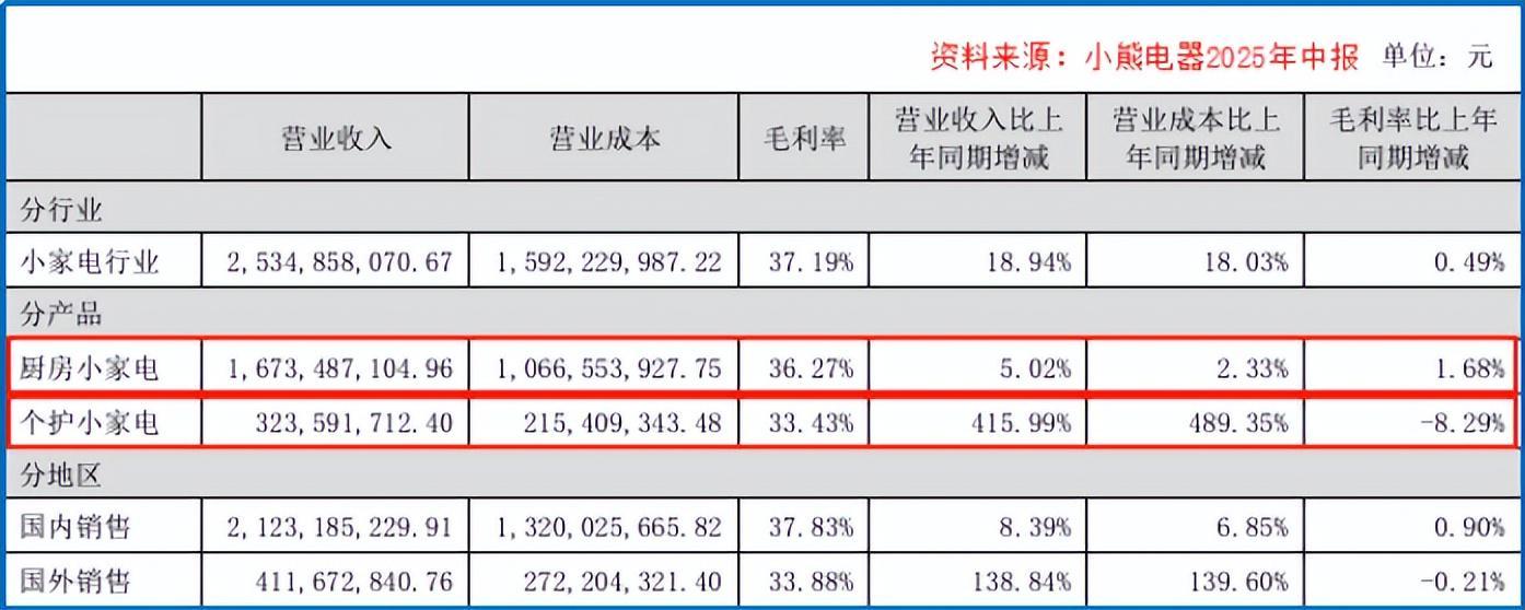 效果立竿见影。2024年,个护业务在小熊营收中占比只有7.6%;到了2025年上半年,已迅速涨到12.77%,成为公司第二大业务。