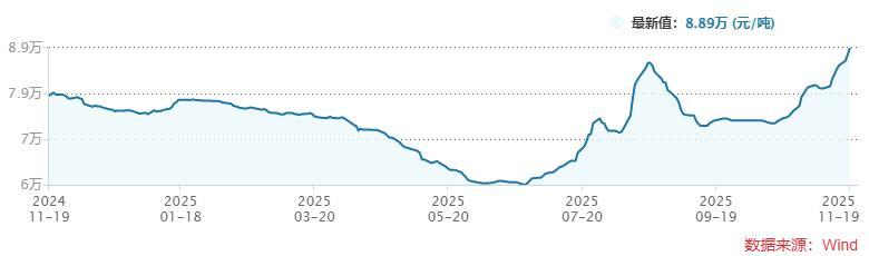 11月19日交易数据显示,碳酸锂期货主力合约不仅盘中突破10万元/吨,其2604至2611等8个合约收盘价均站稳10万元上方。现货市场方面,Wind数据显示11月19日碳酸锂(99.5%电,国产)报价达8.89万元/吨,较上半年低点6万元/吨已反弹近50%。