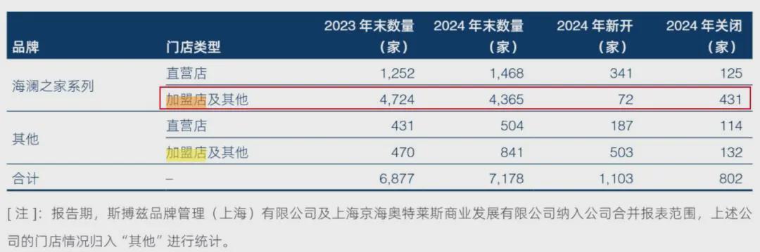 近年来,海澜之家系列的加盟店数量持续减少。财报显示,2022年至2024年,海澜之家系列的加盟店及其他门店分别净关闭57家、164家、359家,三年累计净关闭580家。进入2025年,这一趋势并未得到遏制。截至2025年三季度末,海澜之家系列的加盟店及其他门店共4101家,较年初的4365家净减少264家。