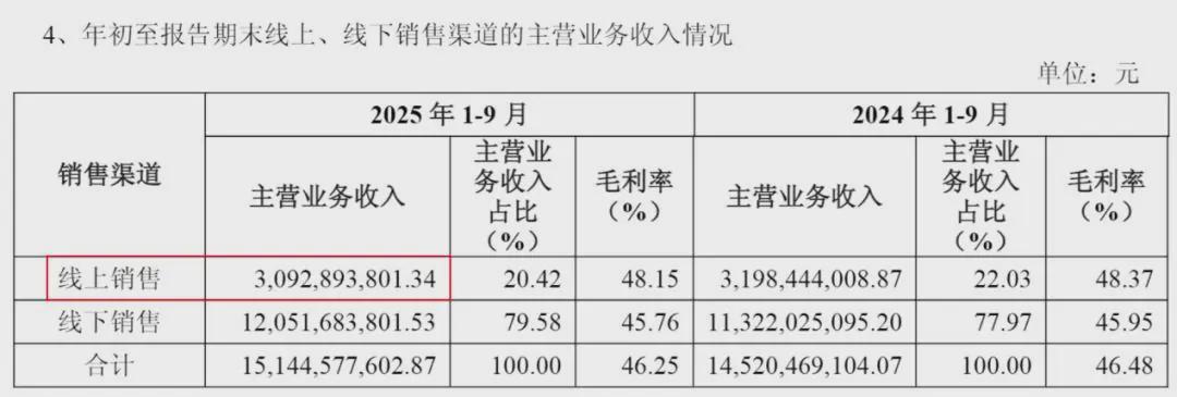 除了线下门店承压外,海澜之家的线上渠道也是短板。今年前三季度,公司线上销售实现营收为31亿元,同比下降3%,占总营业收入(156亿元)的比例不足20%。