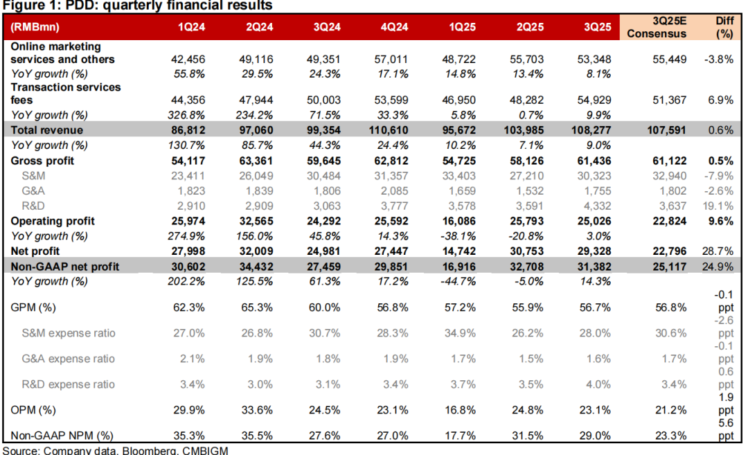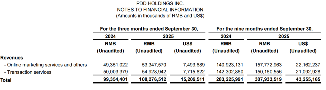 从业务结构看,拼多多正面临核心增长引擎切换的阵痛。三季度交易服务收入549.29亿元同比增长9.9%,占总营收比例达50.7%,成为营收增长核心动力。然而,传统高毛利业务——在线营销服务收入533.48亿元,同比增速仅8.1%,较2024年同期24.3%的增速下滑16.2个百分点,且低于市场预期4%。