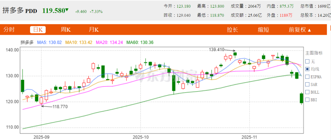2025年11月18日,拼多多披露三季度财报后,市场反应呈现撕裂态势:尽管总营收1082.765亿元同比增长9%,但管理层在电话会议中罕见使用“反复波动”“牺牲利润”“阶段性劣势”等负面表述,并明确“本季度利润不能作为未来指引”。这一预警直接导致美股当日大幅低开,收盘暴跌7.33%至每股119.58美元,创下近年罕见跌幅。