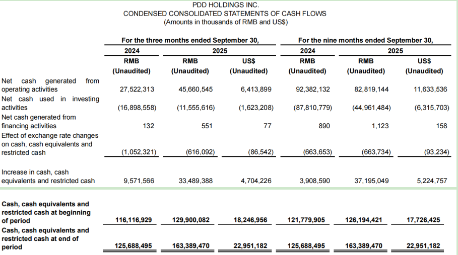 值得注意的是,拼多多现金储备虽高达4238亿元(较2024年末增长27.8%),但资本运作极为保守:三季度投资活动现金流净流出115.56亿元主要用于短期投资,筹资活动现金流仅净流入551万元。这种“现金囤积”策略与阿里、京东等同行通过并购拓展生态的路径形成鲜明对比。