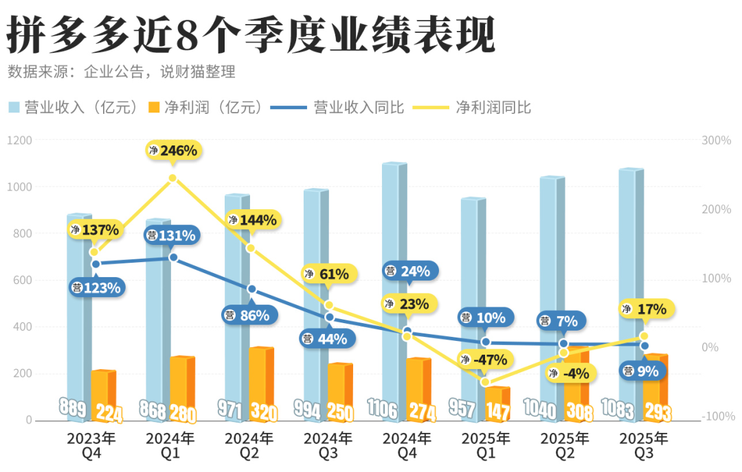 三季度,拼多多实现总收入1082.77亿,同比增长9%;净利润293.28亿,同比增长17%。
