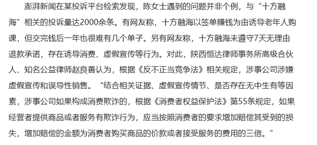 澎湃新闻在某投诉平台检索发现,陈女士遇到的问题并非个例,与“十方融海”相关的投诉量达2000余条。有网友称,十方融海以签单赚钱为由诱导老年人购课,但交完钱后一年也很难有几个单子。