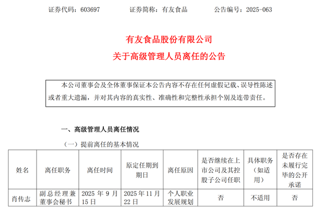 一则高管离职公告,让“泡椒凤爪第一股”有友食品(603697.SH)成为资本市场焦点。公告显示,公司副总经理兼董事会秘书肖传志因个人职业发展规划辞职,此时距离其上任仅三个月。这一“闪电离职”背后,是自2019年上市以来五年内五任董秘相继离任的罕见现象。