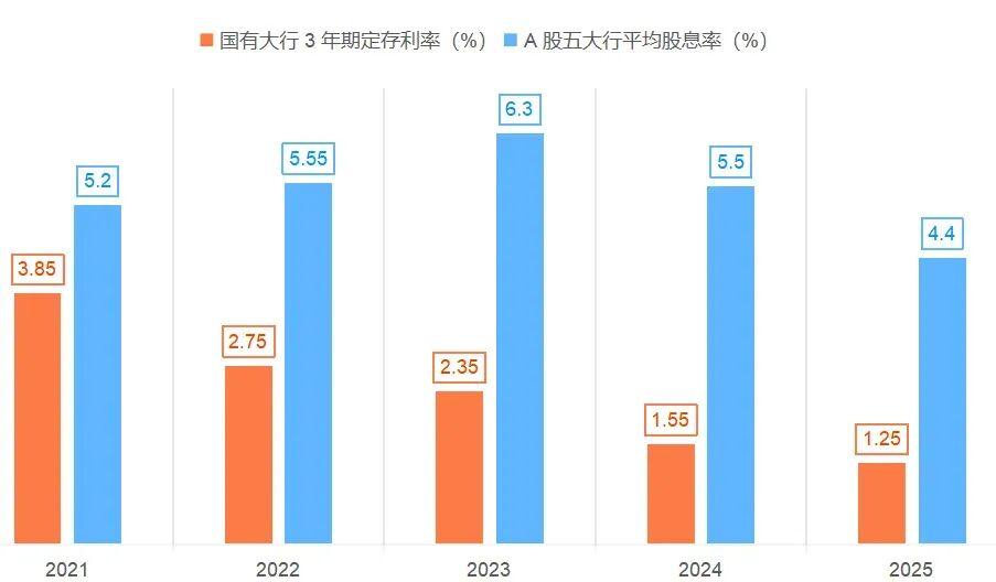 这一政策导向下,普通投资者面临关键抉择:是继续将资金存入银行,还是转向银行股投资?资金逐利特性决定其流向更具吸引力的领域。数据显示,国有大行三年期定存利率从2021年的3.85%持续下滑至2025年的1.25%,而股市中五大行业平均股息率长期维持在5%以上——2021年至2023年分别为5.2%、5.55%、6.3%,尽管2024年因股价上涨稀释至5.5%,2025年仍达4.4%。