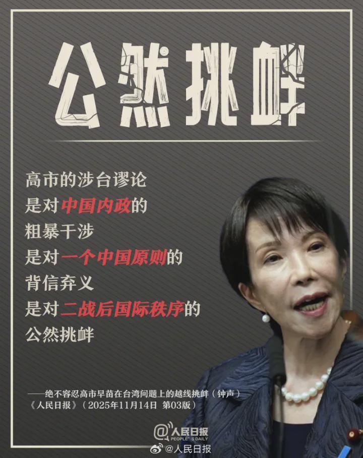 高市早苗公然挑衅二战后国际秩序 图:人民日报微博端