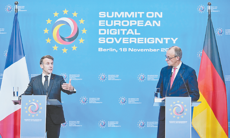 当地时间18日,法国总统马克龙(左)和德国总理默茨(右)出席在柏林举行的“欧洲数字主权峰会”。(视觉中国)