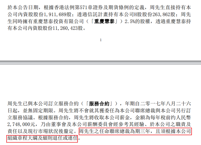 获任联席总裁时,公告显示周小川任职时间三年,后续将根据公司组织章程大纲及细则退任或连任。11月17日,因“个人原因”辞职时,他在联席总裁岗位时间超过三年。