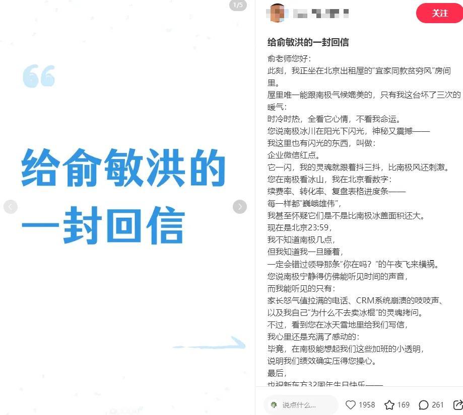 此次风波源于11月16日新东方成立32周年纪念日。俞敏洪在南极向全体员工发送内部信后,多名自称新东方员工的网友在社交平台表达不满,称“加班时看到老板在南极旅游无法共情”,引发舆论热议。