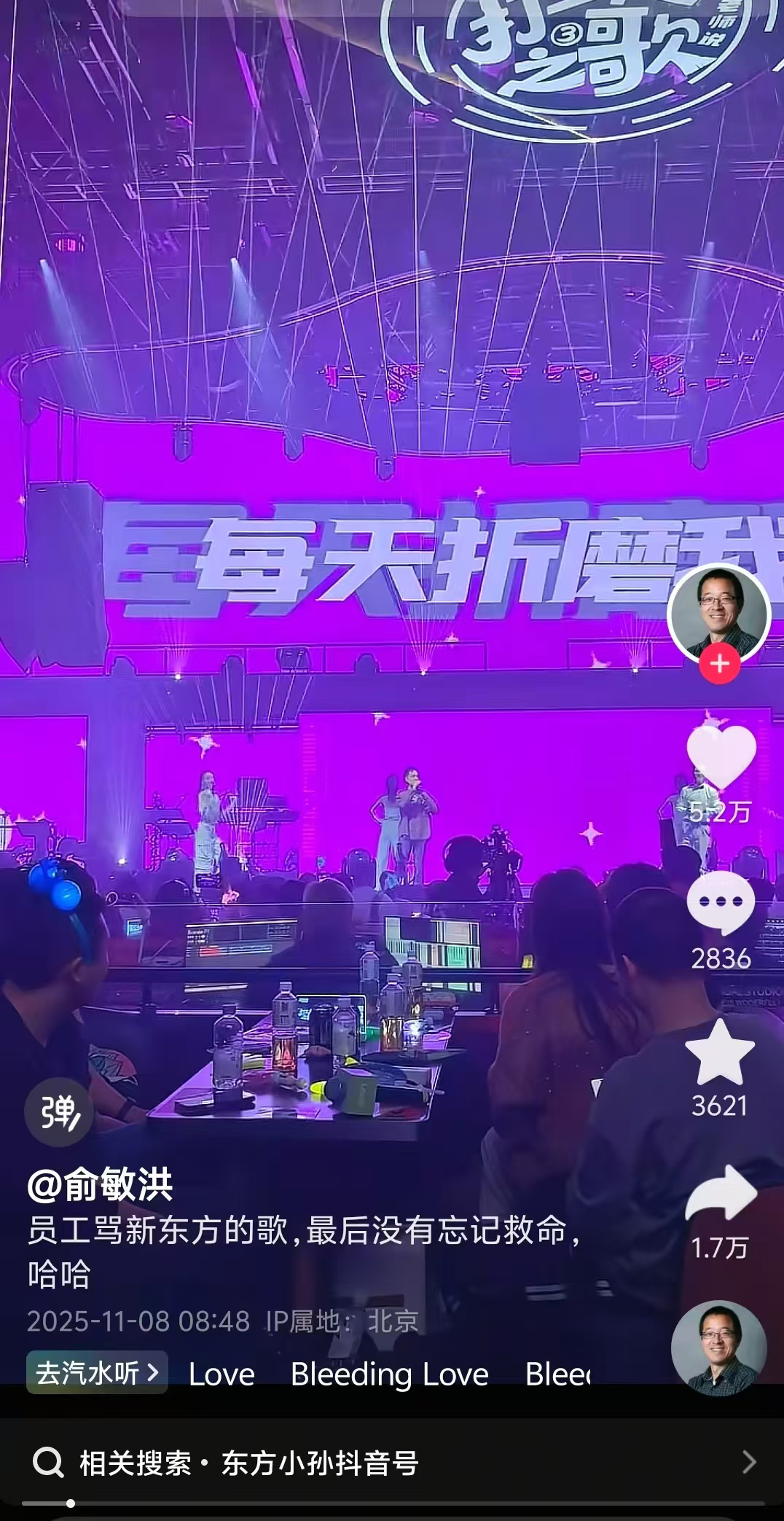 新东方员工“敢言”的企业文化由来已久。2025年11月9日,俞敏洪在抖音转发员工创作的吐槽歌曲《打工人之歌》。该歌曲改编自TFBOYS《青春修炼手册》,歌词直指职场痛点:“日报周报每天折磨我”“业绩导向、续费为王”“休假时钉钉还在响”等,引发打工人强烈共鸣。