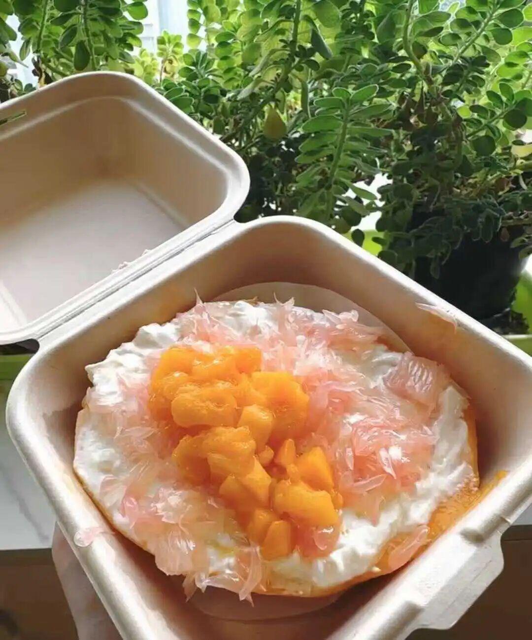 与传统液态杨枝甘露不同,固体版本将芒果泥、西柚果肉与椰浆通过琼脂凝固成块,搭配西米等辅料,打造出可手持的“甜品新形态”。一口下去,果肉扎实、西柚爆汁、西米Q弹,甚至被网友戏称为“代餐神器”。