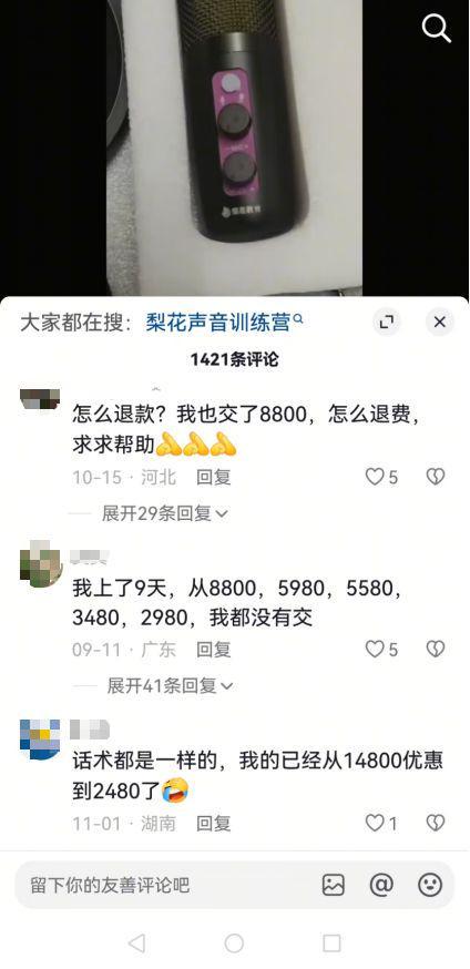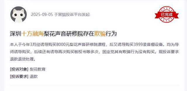 9月5日,学员投诉被导师诱导购买梨花声音研修院课程,后又被诱导购买3999录音棚设备。