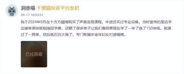 9月17日,学员投诉购买了声音变现课程,中途还买了专业设备,当时宣传是边学边接单很快能挣回学费,结果学了一年赚了150元。