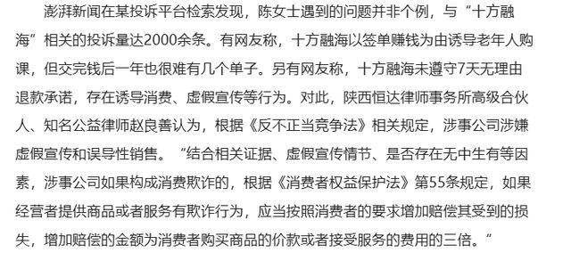 澎湃新闻在某投诉平台检索发现,陈女士遇到的问题并非个例,与“十方融海”相关的投诉量达2000余条。有网友称,十方融海以签单赚钱为由诱导老年人购课,但交完钱后一年也很难有几个单子。
