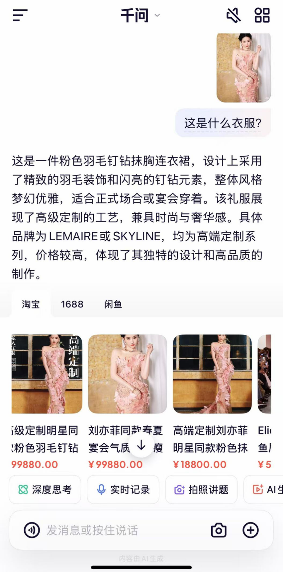 这种识别能力在时尚领域同样出色。上传一张明星走秀图,千问能准确识别出服装品牌是LEMAIRE或SKYLINE的高定系列。更实用的是,它还会主动从淘宝、1688和闲鱼上搜索同款平替,一键就能跳转下单。