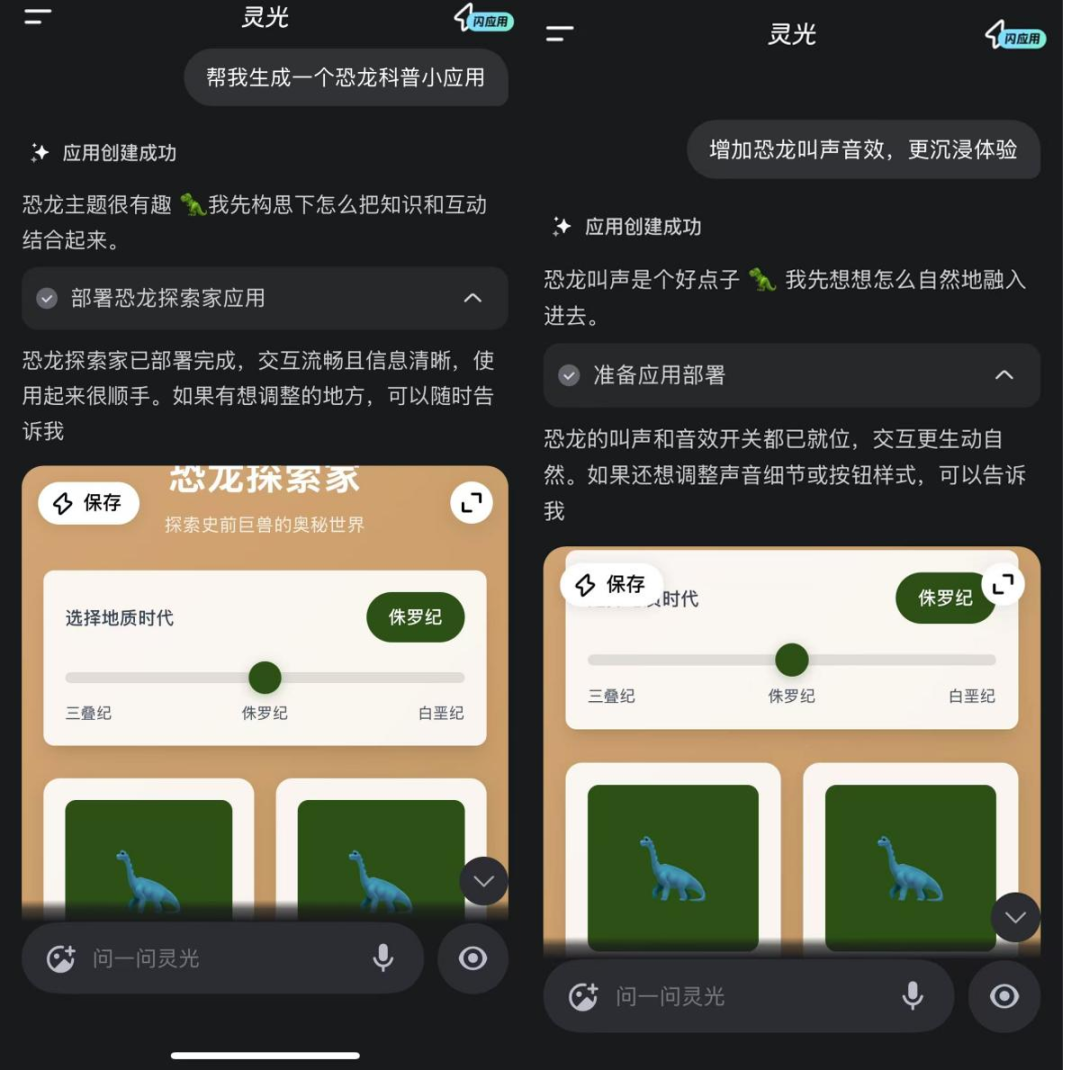 我尝试让灵光创建一个恐龙科普应用,它不仅在短时间内完成,还主动建议增加恐龙叫声音效,连UI设计都一并搞定。