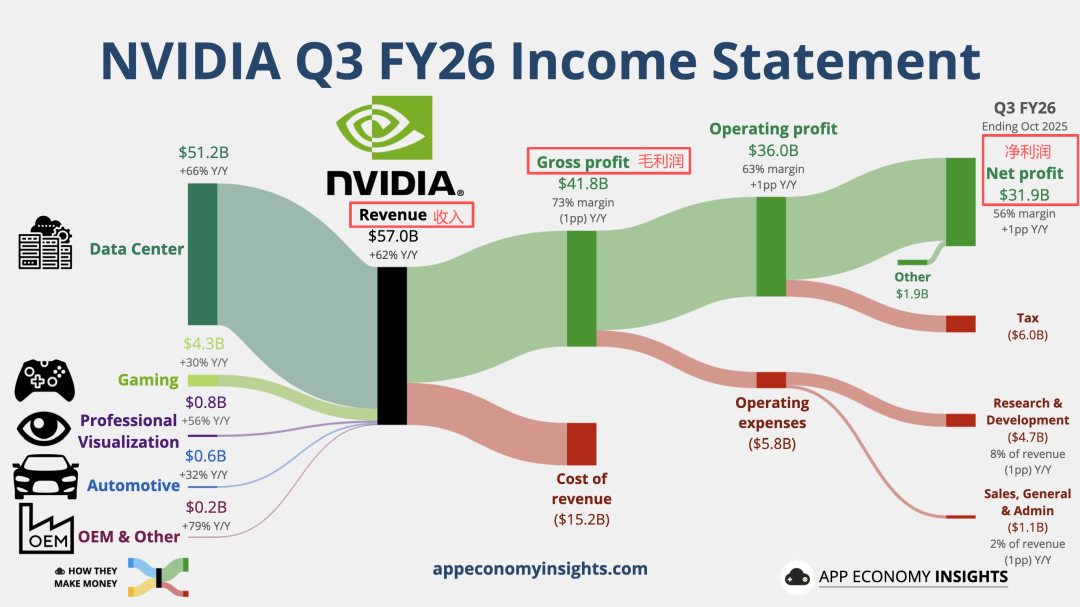 具体来看,英伟达第三季度营收高达570亿美元(约合4056亿人民币),同比增长62%;毛利润更是达到了418亿美元(约合2975亿人民币),同比增长73%;净利润也达到了319亿美元(约合2270亿人民币),同比增长56%。这样的业绩表现,无疑堪称“炸裂”。