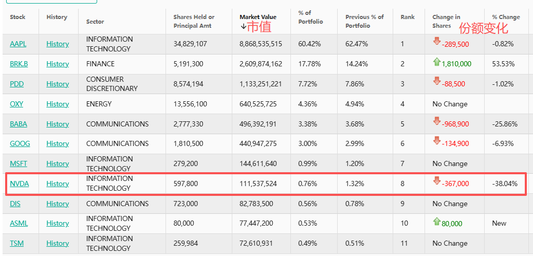 在这种背景下,似乎“一夜之间”,每个人都在卖英伟达。最近一段时间,软银、段永平以及全球对冲基金等纷纷减持或清仓英伟达股票。以段永平为例,截至今年三季度末,其美股持仓主体的持仓市值达到146.79亿美元,但其中对英伟达的持仓却大幅减少了38.04%,减持后占比仅0.76%。而段永平美股持仓最高的是苹果,其次是伯克希尔和拼多多。