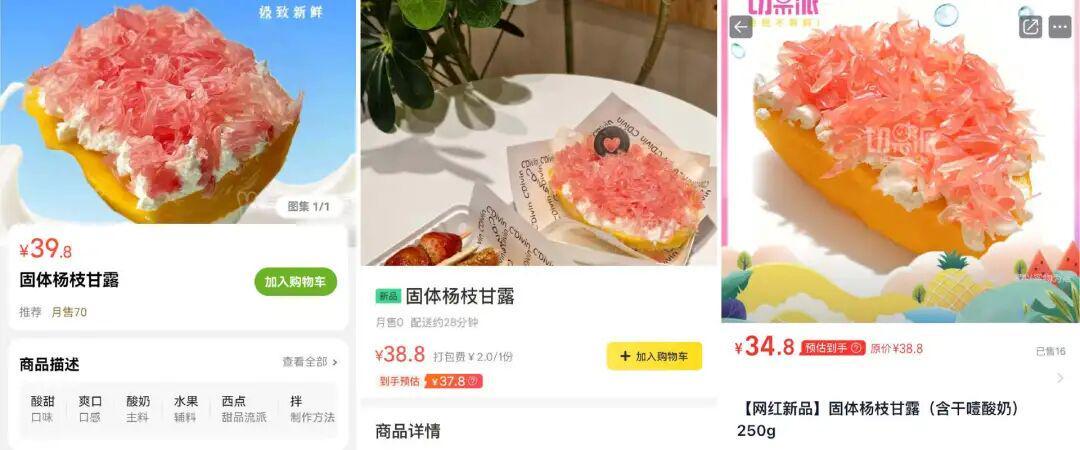 这场甜品革命迅速蔓延至整个餐饮行业。外卖平台显示,除茶饮品牌外,甜品店、烘焙坊、火锅店甚至果切店、炒货店都纷纷推出固体杨枝甘露,优惠后价格集中在25-40元区间。