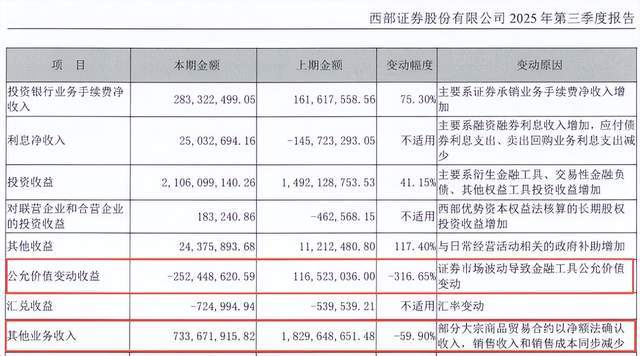 西部证券成为唯一一家营收下降的A股券商,主要受两大因素影响:一是公允价值变动收益由2024年同期的盈利1.17亿元变成亏损2.52亿元,较2024年同期减少3.69亿元。根据西部证券解释,主要因证券市场波动导致金融工具公允价值变动。二是其他业务收入7.34亿元,较2024年同期减少10.96亿元,降幅59.9%,主要因部分大宗商品贸易合约以净额法确认收入,销售收入和销售成本同步减少。